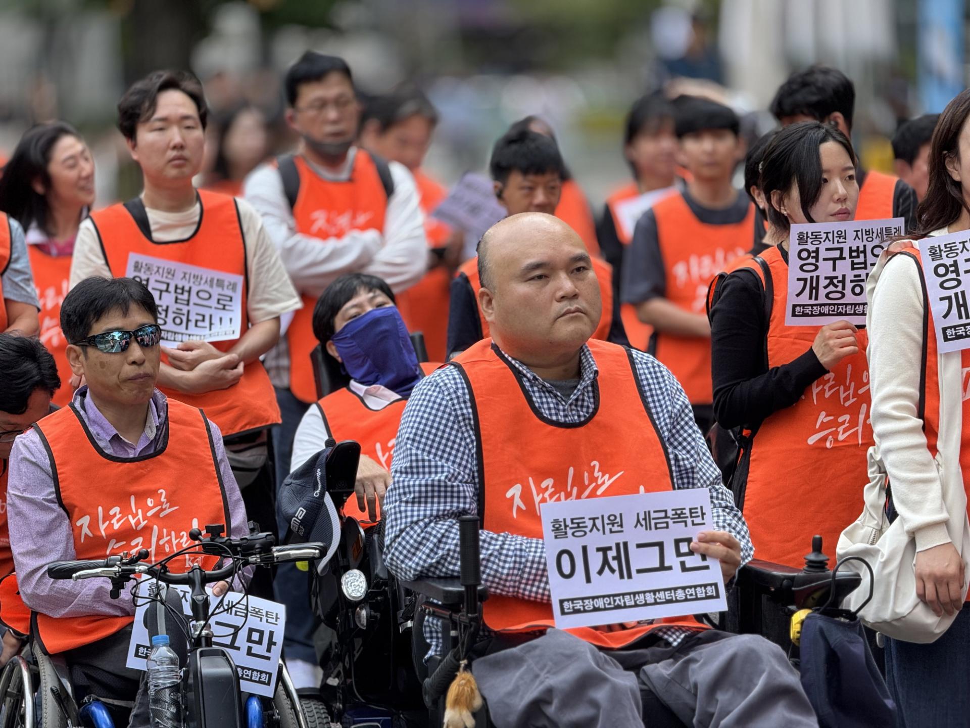 전국의 장애인자립생활센터 전체 활동가들이 정부와 국회는 더 이상 장애인의 생존권을 불안정한 한시법에 맡겨두지 말고, 책임 있게 제도 개선에 나서야 한다! 고 강하게 촉구하며 장애인의 권리를 쟁취하겠습니다.