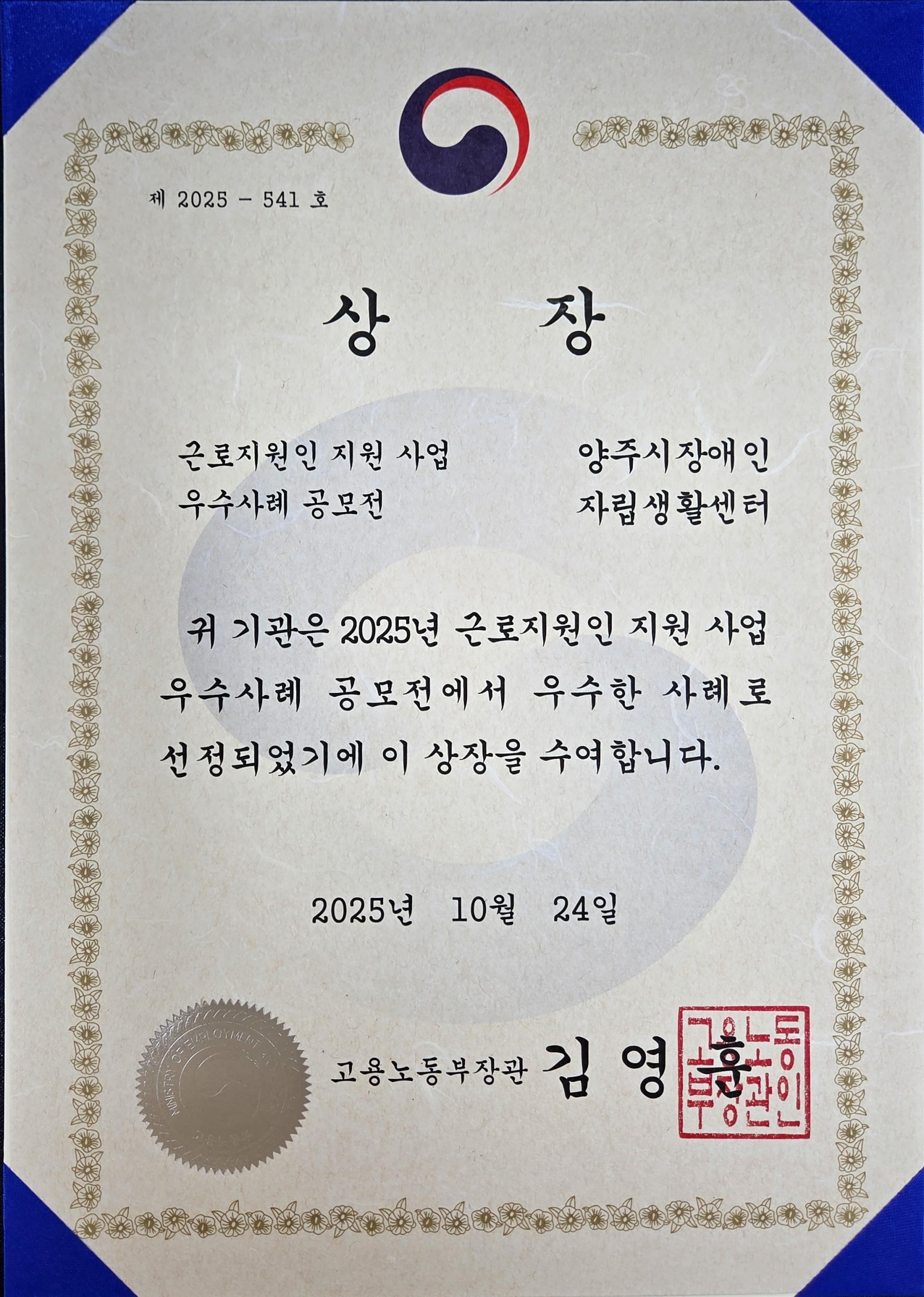 근로지원인 사업 운영의 우수성과 체계적인 지원 관리가 높이 평가받은 결과입니다.