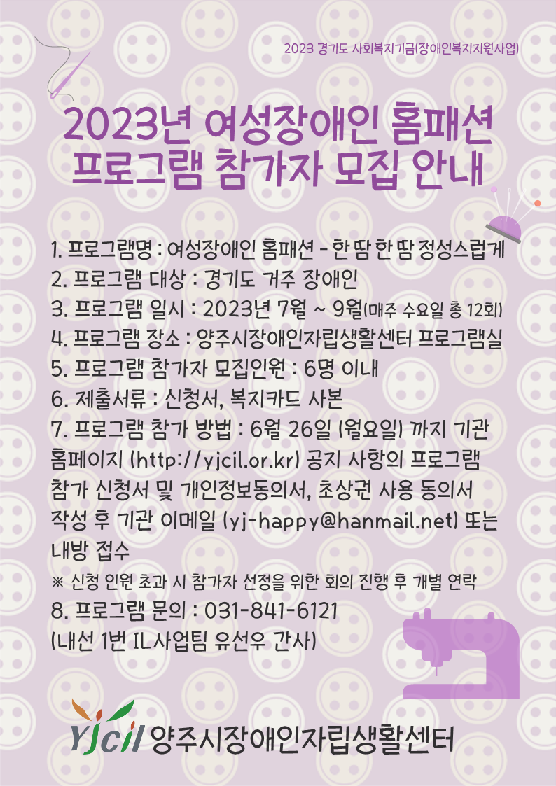 경기도 양주시 부흥로 1936 다온프라자 6층 603호센터장 고황석 TEL.031-841-6121 FAX. 031-840-6122 E-MAIL. yj-happy@hanmail.netCOPYRIGHT 2020 양주시장애인자립생활센터 . All rights Reserved