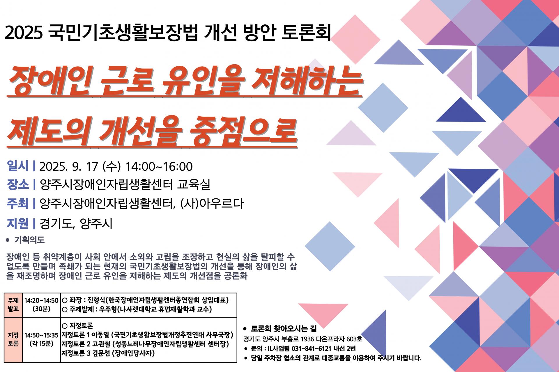 우리 기관에서는 2025년 9월 17일(수요일) 2025 국민기초생활보장법 개선 방안 토론회 - "장애인 근로 유인을 저해하는 제도의 개선을 중점으로" 를 아래와 같이 개최합니다. 많은 관심과 참여 바랍니다.